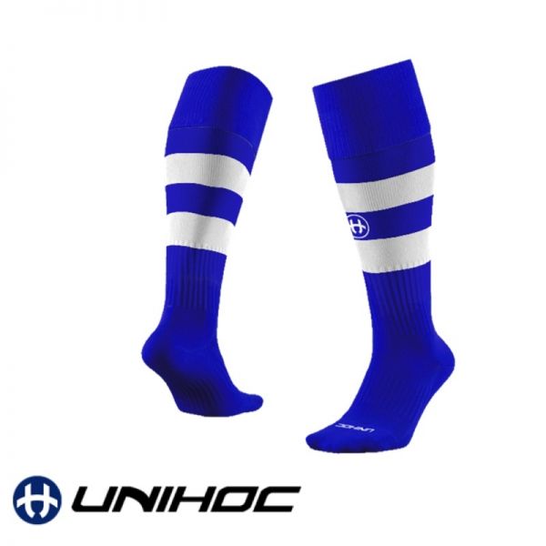 Professionelle Stutzen von Unihoc in Blau-Weiß gestreift mit einem großen Unihoc-Logo
